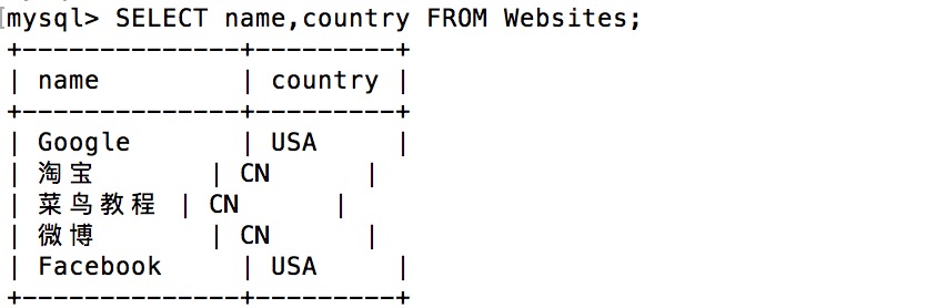 +----+--------------+---------------------------+-------+---------+| id | name | url | alexa | country |+----+--------------+---------------------------+-------+---------+| 1 | Google | https://www.google.cm/ | 1 | USA || 2 | 淘宝 | https://www.taobao.com/ | 13 | CN || 3 | 菜鸟教程 | http://www.runoob.com/ | 4689 | CN || 4 | 微博 | http://weibo.com/ | 20 | CN || 5 | Facebook | https://www.facebook.com/ | 3 | USA |+----+--------------+---------------------------+-------+---------+